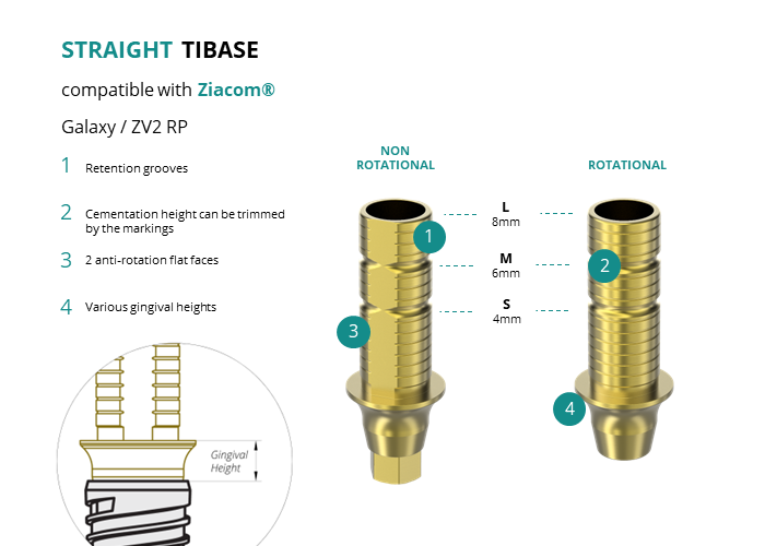 GT-Medical's Ti-Base are compatible with Galaxy / ZV2 RP implants from Ziacom®, allowing a stable and long-lasting connection between the implant and the prosthesis. They are made entirely of Titanium Grade 5 with a yellow anodized for a more aesthetic finish. They have a cementation trunk that can be cut to various heights, 2 flat faces to perform the anti-rotating function and a gingival body of various heights, depending on the type of connection.