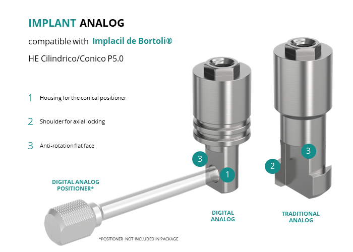 - Digital Analog: for models made of resin through 3D printing, locking is achieved using a slightly conical positioner, ensuring axial positioning.