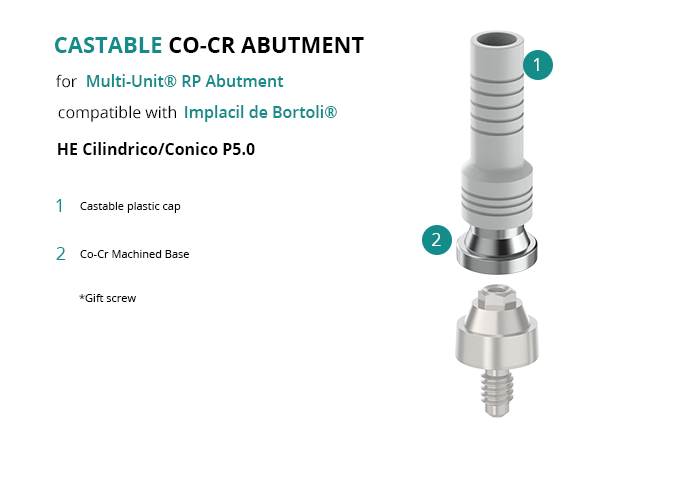 GT-Medical's castable Co-Cr abutment is compatible with HE Cilindrico/Conico P5.0 implants from Implacil de Bortoli®, ensuring a solid base for the prosthetic structure and guaranteeing an optimal fit with the Multi-Unit® RP Abutment. It is made up of a machined Cobalt Chrome base and a castable plastic cap.