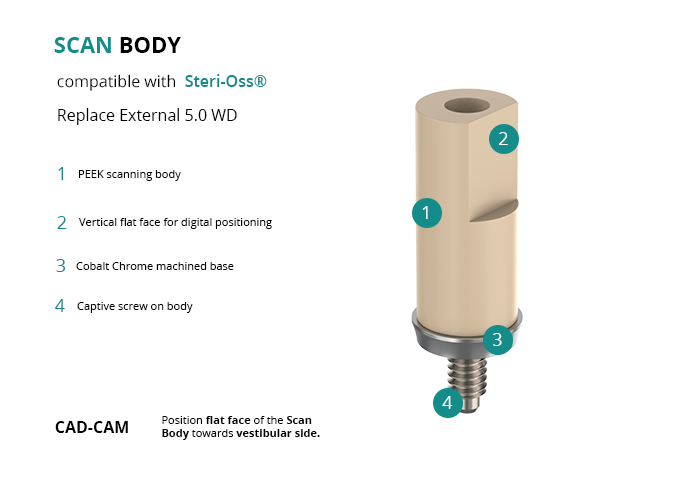 - CAD-CAM: Position flat face of the Scan Body towards vestibular side