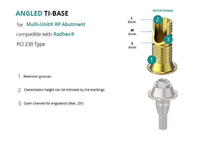 GT-Medical's Angled Ti-Base are compatible with PCI 230 Type implants from Radhex®, ensuring a stable and long-lasting connection between the Multi-Unit® RP Abutment and the prosthesis, while also allowing angulations to be corrected up to 25 degrees. They are made entirely of Titanium Grade 5 with a yellow anodizing for a more aesthetic finish. They have a grooved cementation trunk that can be cut to various heights.
