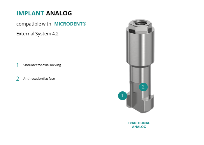 The GT-Medical analog compatible with the Microdent® External System 4.2 implant line is made of Stainless Steel, has a diameter of 4.2mm, and accurately replicates the connection of this Microdent® implant.
