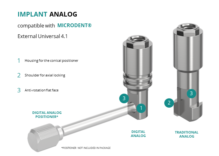 The GT-Medical analog compatible with the Microdent® External Universal 4.1 implant line is made of Stainless Steel, has a diameter of 4.1mm, and accurately replicates the connection of this Microdent® implant.