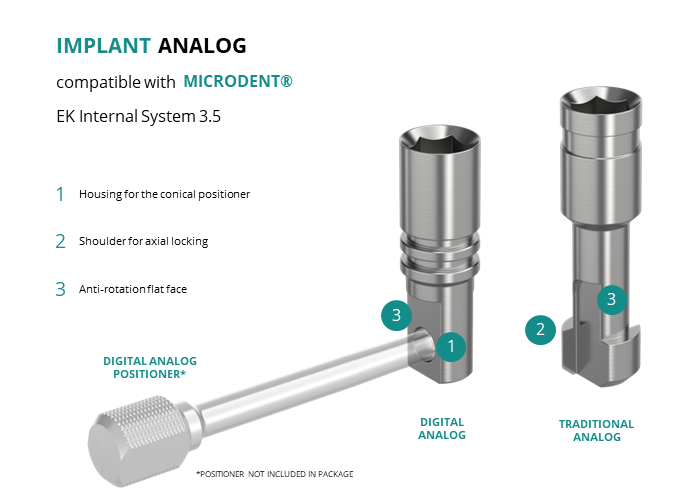 The GT-Medical analog compatible with the Microdent® EK Internal System 3.5 implant line is made of Stainless Steel, has a diameter of 3.5mm, and accurately replicates the connection of this Microdent® implant.