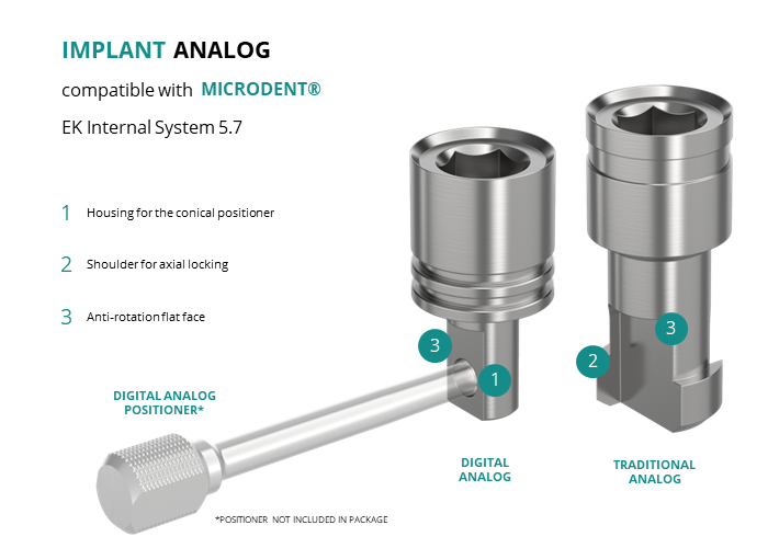 The GT-Medical analog compatible with the Microdent® EK Internal System 5.7 implant line is made of Stainless Steel, has a diameter of 5.7mm, and accurately replicates the connection of this Microdent® implant.