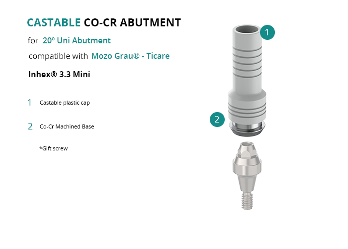Castable Abutment with Co-Cr Base for 20º Uni Abutment compatible with Mozo Grau® - Ticare Inhex® 3.3 Mini