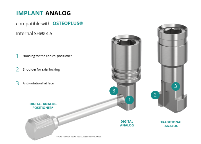The GT-Medical analog compatible with the Osteoplus® Internal SHi® 4.5 implant line is made of Stainless Steel, has a diameter of 4.5mm, and accurately replicates the connection of this Osteoplus® implant.