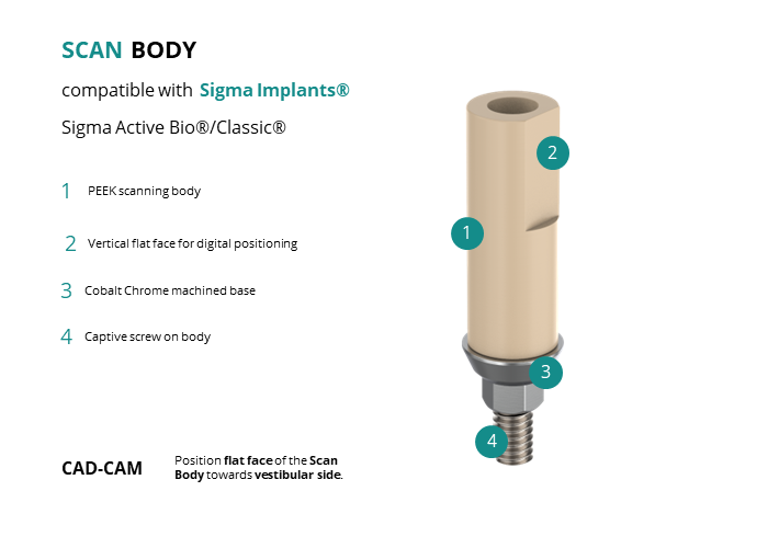 - CAD-CAM: Position flat face of the Scan Body towards vestibular side.