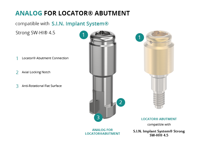 The analog for Locator® Abutment is essential for creating the model of a removable overdenture restoration that uses Locator® abutments on implants, such as those from S.I.N. Implant System® with the Strong SW-HI® 4.5 platform.