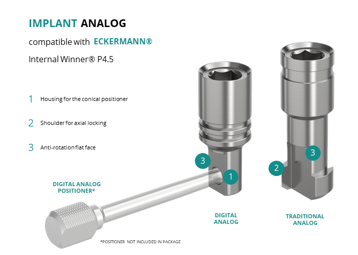 - Digital Analog: for models made of resin through 3D printing, locking is achieved using a slightly conical positioner, ensuring axial positioning.
