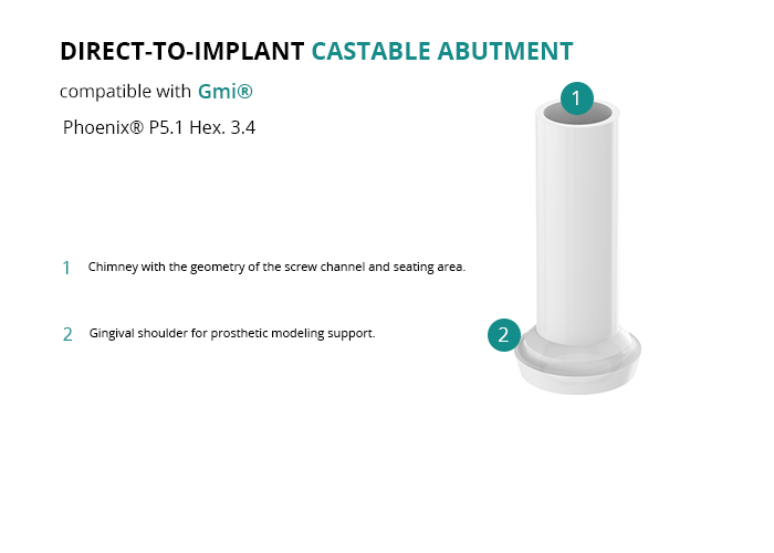 The direct-to-implant castable is ideal for creating customized abutments and screw-retained frameworks, ensuring a reliable and high-quality fit for restorations on implants with the Phoenix® P5.1 Hex. 3.4 platform from Gmi®.