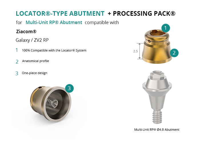 Locator®-Type Abutment for Multi-Unit® RP Compatible with Ziacom® Galaxy / ZV2 RP