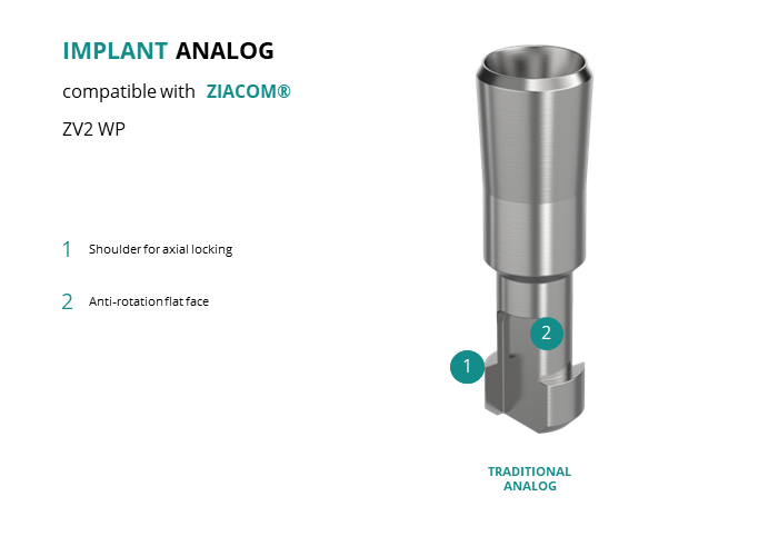 The GT-Medical analog compatible with the Ziacom® ZV2 WP implant line is made of Stainless Steel, has a diameter of 4.5mm, and accurately replicates the connection of this Ziacom® implant.
