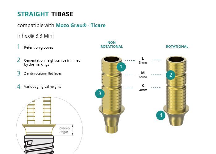 GT-Medical's Ti-Base are compatible with Inhex® 3.3 Mini implants from Mozo Grau® - Ticare, allowing a stable and long-lasting connection between the implant and the prosthesis. They are made entirely of Titanium Grade 5 with a yellow anodized for a more aesthetic finish. They have a cementation trunk that can be cut to various heights, 2 flat faces to perform the anti-rotating function and a gingival body of various heights, depending on the type of connection.