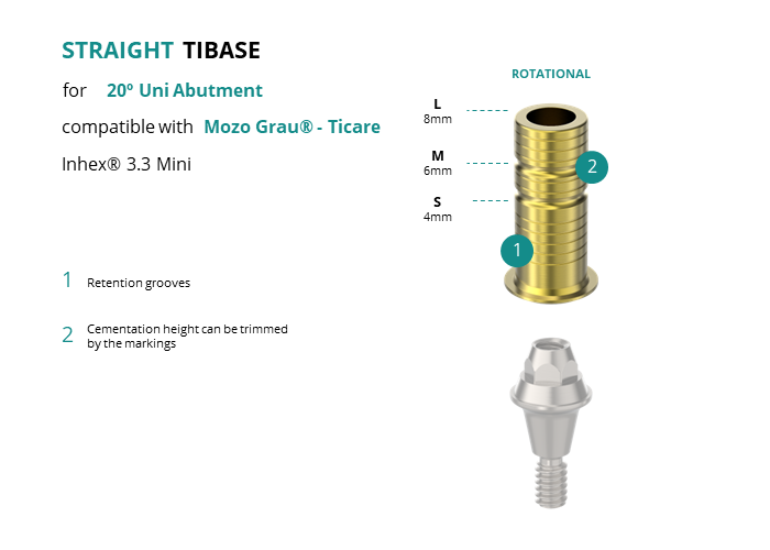 GT-Medical's Ti-Base are compatible with Inhex® 3.3 Mini implants from Mozo Grau® - Ticare, allowing a stable and long-lasting connection between the 20º Uni Abutment and the prosthesis. They are made entirely of Titanium Grade 5 with a yellow anodized for a more aesthetic finish. They have a grooved cementation trunk that can be cut to various heights.