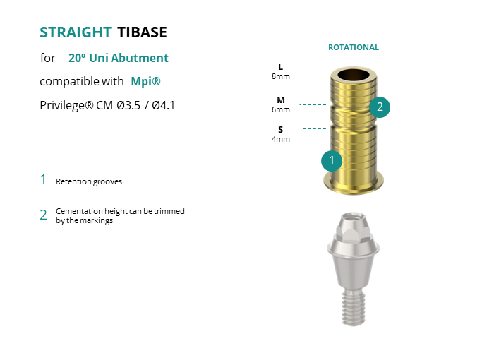 GT-Medical's Ti-Base are compatible with Privilege® CM Ø3.5 / Ø4.1 implants from Mpi®, allowing a stable and long-lasting connection between the 20º Uni Abutment and the prosthesis. They are made entirely of Titanium Grade 5 with a yellow anodized for a more aesthetic finish. They have a grooved cementation trunk that can be cut to various heights.
