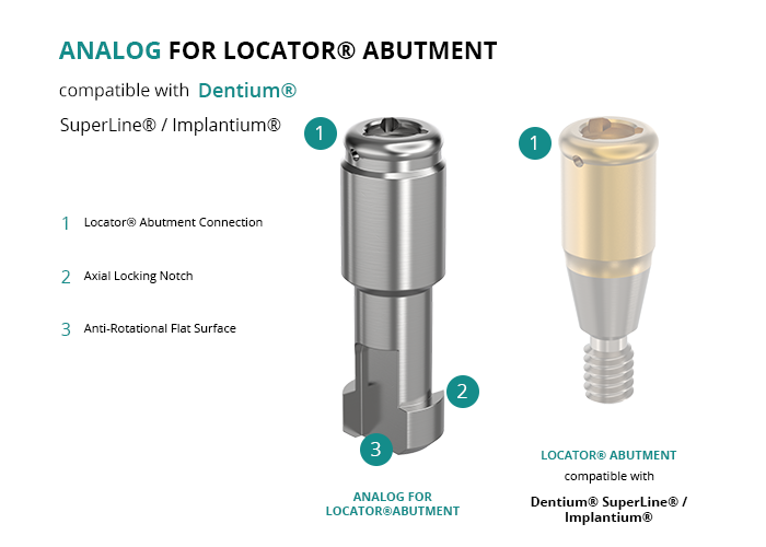 The analog for Locator® Abutment is essential for creating the model of a removable overdenture restoration that uses Locator® abutments on implants, such as those from Dentium® with the SuperLine® / Implantium® platform.