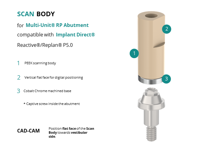 Scan Body for Multi-Unit® RP Abutment compatible with Implant Direct® Reactive®/Replan® P5.0