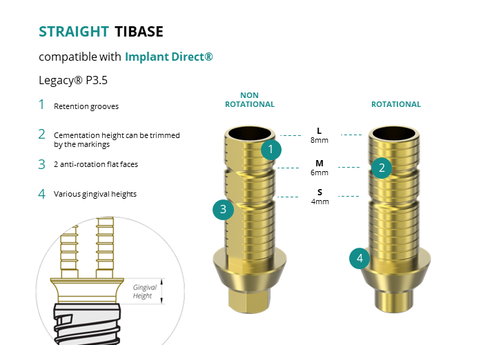 GT-Medical's Ti-Base are compatible with Legacy® P3.5 implants from Implant Direct®, allowing a stable and long-lasting connection between the implant and the prosthesis. They are made entirely of Titanium Grade 5 with a yellow anodized for a more aesthetic finish. They have a cementation trunk that can be cut to various heights, 2 flat faces to perform the anti-rotating function and a gingival body of various heights, depending on the type of connection.