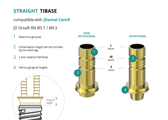GT-Medical's Ti-Base are compatible with JD Octa® RN Ø3.7 / Ø4.3 implants from JDental Care®, allowing a stable and long-lasting connection between the implant and the prosthesis. They are made entirely of Titanium Grade 5 with a yellow anodized for a more aesthetic finish. They have a cementation trunk that can be cut to various heights, 2 flat faces to perform the anti-rotating function and a gingival body of various heights, depending on the type of connection.