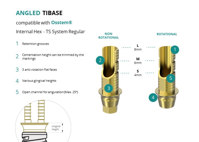 GT-Medical's Angled Ti-Base are compatible with Internal Hex - TS System Regular implants from Osstem®, ensuring a stable and long-lasting connection between the implant and the prosthesis, while also allowing angulations to be corrected up to 25 degrees. They are made entirely of Titanium Grade 5 with a yellow anodizing for a more aesthetic finish. They have a cementation trunk that can be cut to various heights with an open channel to allow angulation, 3 flat faces to perform the anti-rotating function and a gingival body of various heights, depending on the type of connection.