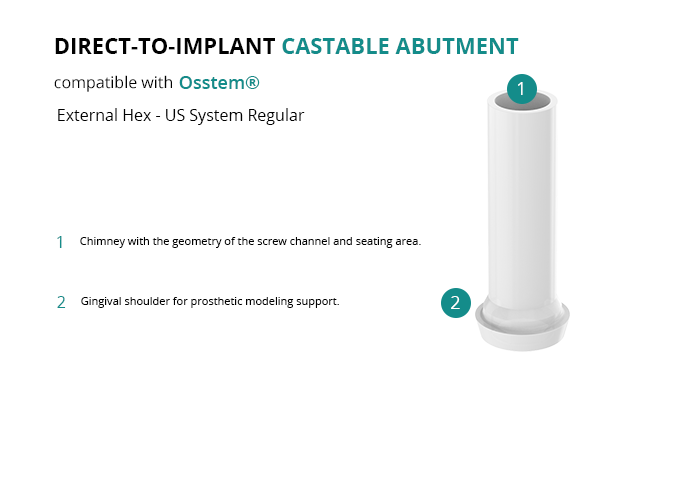 The direct-to-implant castable is ideal for creating customized abutments and screw-retained frameworks, ensuring a reliable and high-quality fit for restorations on implants with the External Hex - US System Regular platform from Osstem®.
