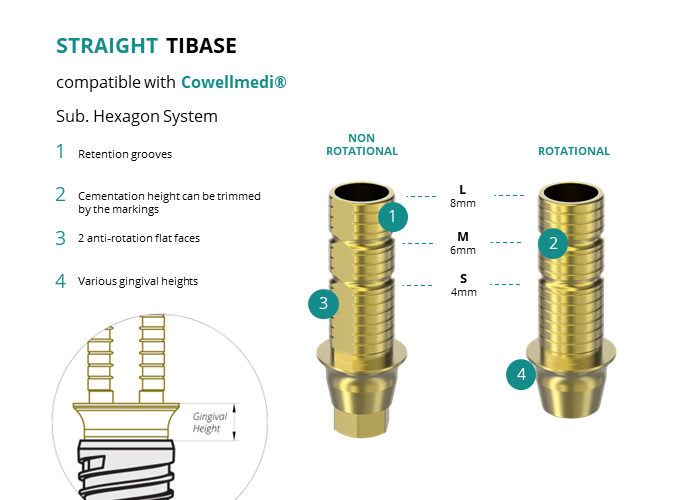 GT-Medical's Ti-Base are compatible with Sub. Hexagon System implants from Cowellmedi®, allowing a stable and long-lasting connection between the implant and the prosthesis. They are made entirely of Titanium Grade 5 with a yellow anodized for a more aesthetic finish. They have a cementation trunk that can be cut to various heights, 2 flat faces to perform the anti-rotating function and a gingival body of various heights, depending on the type of connection.