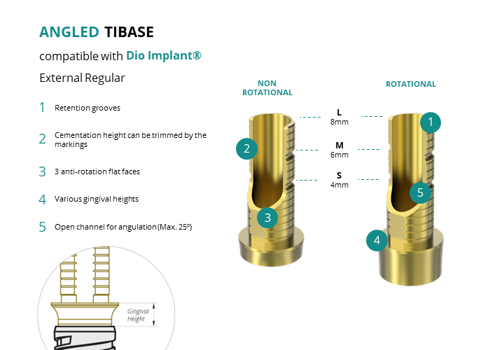 GT-Medical's Angled Ti-Base are compatible with External Regular implants from Dio Implant®, ensuring a stable and long-lasting connection between the implant and the prosthesis, while also allowing angulations to be corrected up to 25 degrees. They are made entirely of Titanium Grade 5 with a yellow anodizing for a more aesthetic finish. They have a cementation trunk that can be cut to various heights with an open channel to allow angulation, 3 flat faces to perform the anti-rotating function and a gingival body of various heights, depending on the type of connection.