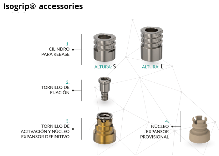 - Titanium piece that attaches the IsoGrip® System to the overdenture, exerting a slight pressure until a "Click" is felt.