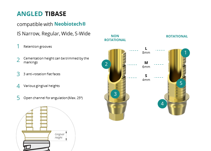 GT-Medical's Angled Ti-Base are compatible with IS Narrow, Regular, Wide, S-Wide implants from Neobiotech®, ensuring a stable and long-lasting connection between the implant and the prosthesis, while also allowing angulations to be corrected up to 25 degrees. They are made entirely of Titanium Grade 5 with a yellow anodizing for a more aesthetic finish. They have a cementation trunk that can be cut to various heights with an open channel to allow angulation, 3 flat faces to perform the anti-rotating function and a gingival body of various heights, depending on the type of connection.