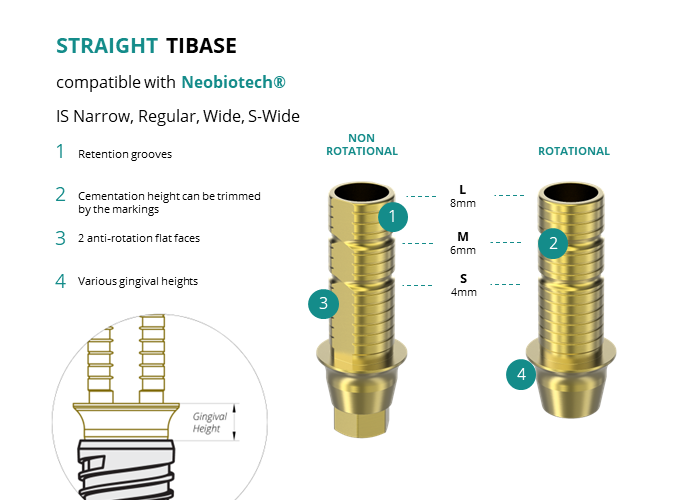 GT-Medical's Ti-Base are compatible with IS Narrow, Regular, Wide, S-Wide implants from Neobiotech®, allowing a stable and long-lasting connection between the implant and the prosthesis. They are made entirely of Titanium Grade 5 with a yellow anodized for a more aesthetic finish. They have a cementation trunk that can be cut to various heights, 2 flat faces to perform the anti-rotating function and a gingival body of various heights, depending on the type of connection.