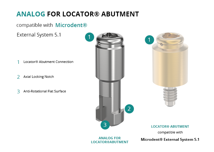The analog for Locator® Abutment is essential for creating the model of a removable overdenture restoration that uses Locator® abutments on implants, such as those from Microdent® with the External System 5.1 platform.