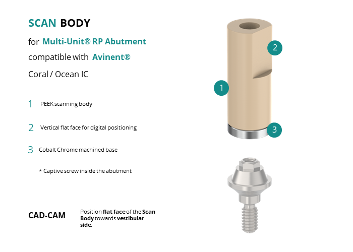 - CAD-CAM: Position flat face of the Scan Body towards vestibular side.