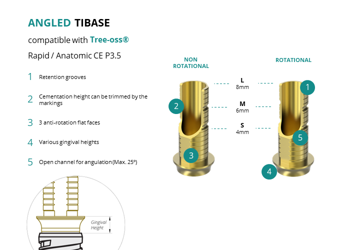 GT-Medical's Angled Ti-Base are compatible with Rapid / Anatomic CE P3.5 implants from Tree-oss®, ensuring a stable and long-lasting connection between the implant and the prosthesis, while also allowing angulations to be corrected up to 25 degrees. They are made entirely of Titanium Grade 5 with a yellow anodizing for a more aesthetic finish. They have a cementation trunk that can be cut to various heights with an open channel to allow angulation, 3 flat faces to perform the anti-rotating function and a gingival body of various heights, depending on the type of connection.