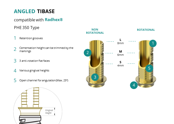 GT-Medical's Angled Ti-Base are compatible with PHE 350 Type implants from Radhex®, ensuring a stable and long-lasting connection between the implant and the prosthesis, while also allowing angulations to be corrected up to 25 degrees. They are made entirely of Titanium Grade 5 with a yellow anodizing for a more aesthetic finish. They have a cementation trunk that can be cut to various heights with an open channel to allow angulation, 3 flat faces to perform the anti-rotating function and a gingival body of various heights, depending on the type of connection.