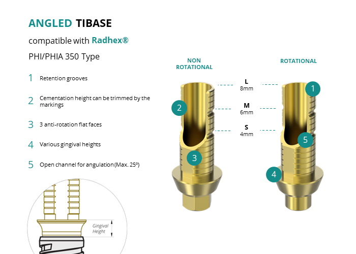 GT-Medical's Angled Ti-Base are compatible with PHI/PHIA 350 Type implants from Radhex®, ensuring a stable and long-lasting connection between the implant and the prosthesis, while also allowing angulations to be corrected up to 25 degrees. They are made entirely of Titanium Grade 5 with a yellow anodizing for a more aesthetic finish. They have a cementation trunk that can be cut to various heights with an open channel to allow angulation, 3 flat faces to perform the anti-rotating function and a gingival body of various heights, depending on the type of connection.
