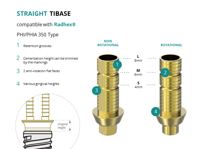 GT-Medical's Ti-Base are compatible with PHI/PHIA 350 Type implants from Radhex®, allowing a stable and long-lasting connection between the implant and the prosthesis. They are made entirely of Titanium Grade 5 with a yellow anodized for a more aesthetic finish. They have a cementation trunk that can be cut to various heights, 2 flat faces to perform the anti-rotating function and a gingival body of various heights, depending on the type of connection.