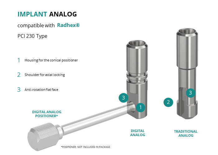 - Digital Analog: for models made of resin through 3D printing, locking is achieved using a slightly conical positioner, ensuring axial positioning.