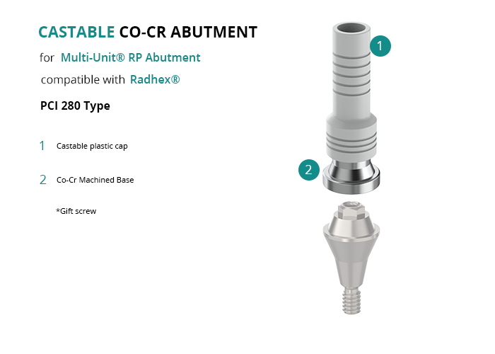 GT-Medical's castable Co-Cr abutment is compatible with PCI 280 Type implants from Radhex®, ensuring a solid base for the prosthetic structure and guaranteeing an optimal fit with the Multi-Unit® RP Abutment. It is made up of a machined Cobalt Chrome base and a castable plastic cap.