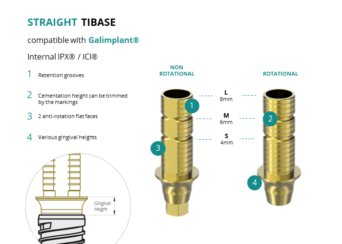 GT-Medical's Ti-Base are compatible with Internal IPX® / ICI® implants from Galimplant®, allowing a stable and long-lasting connection between the implant and the prosthesis. They are made entirely of Titanium Grade 5 with a yellow anodized for a more aesthetic finish. They have a cementation trunk that can be cut to various heights, 2 flat faces to perform the anti-rotating function and a gingival body of various heights, depending on the type of connection.