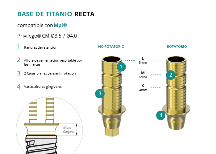 Las Ti-Base Rectas de GT-Medical son compatibles con los implantes Privilege® CM Ø3.5 / Ø4.0 de Mpi®, permitiendo una conexión estable y duradera entre el implante y la prótesis. Están compuestas en su totalidad por Titanio de Grado 5 con un anodizado dorado para un acabado más estético. Poseen un tronco de cementación recortable a varias alturas, 2 caras planas para realizar la función antirotativa y un cuerpo gingival de varias alturas, dependiendo del tipo de conexión.