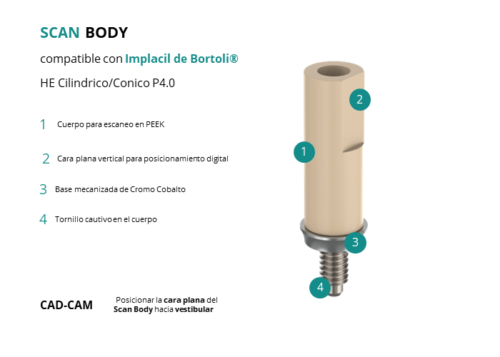 - CAD-CAM: Posicionar la cara plana del Scan Body hacia vestibular.