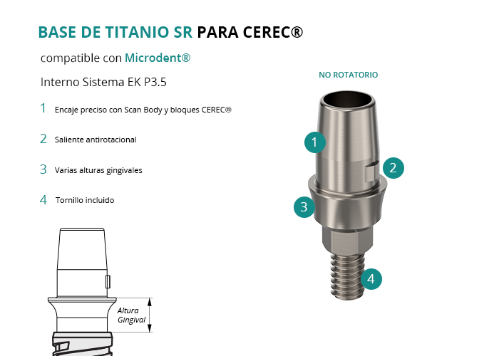 Las Bases de Titanio SR para CEREC® de GT-Medical son compatibles con los implantes Interno Sistema EK P3.5 de Microdent®, fabricadas en Titanio de Grado 5 para una conexión precisa y duradera. Cuentan con un saliente antirotacional que asegura el encaje perfecto con los scan bodies y bloques fresables de CEREC, evitando la rotación. Están disponibles en diversas alturas gingivales para adaptarse a cada caso. El tornillo está incluido en el envase.