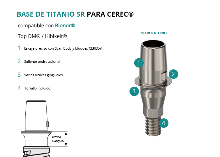 Las Bases de Titanio SR para CEREC® de GT-Medical son compatibles con los implantes Top DM® / Hibikelt® de Bioner®, fabricadas en Titanio de Grado 5 para una conexión precisa y duradera. Cuentan con un saliente antirotacional que asegura el encaje perfecto con los scan bodies y bloques fresables de CEREC, evitando la rotación. Están disponibles en diversas alturas gingivales para adaptarse a cada caso. El tornillo está incluido en el envase.