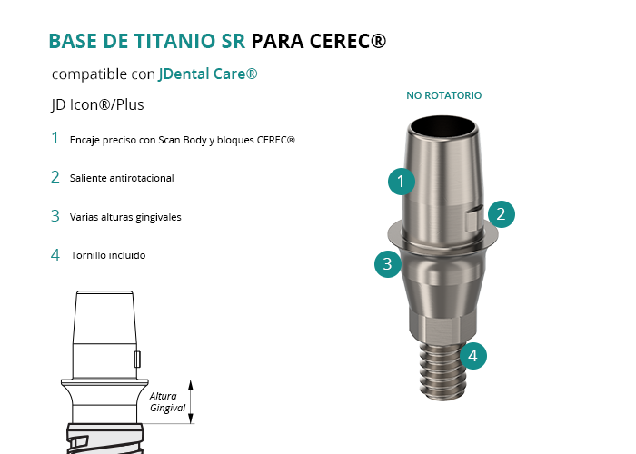 Las Bases de Titanio SR para CEREC® de GT-Medical son compatibles con los implantes JD Icon®/Plus de JDental Care®, fabricadas en Titanio de Grado 5 para una conexión precisa y duradera. Cuentan con un saliente antirotacional que asegura el encaje perfecto con los scan bodies y bloques fresables de CEREC, evitando la rotación. Están disponibles en diversas alturas gingivales para adaptarse a cada caso. El tornillo está incluido en el envase.