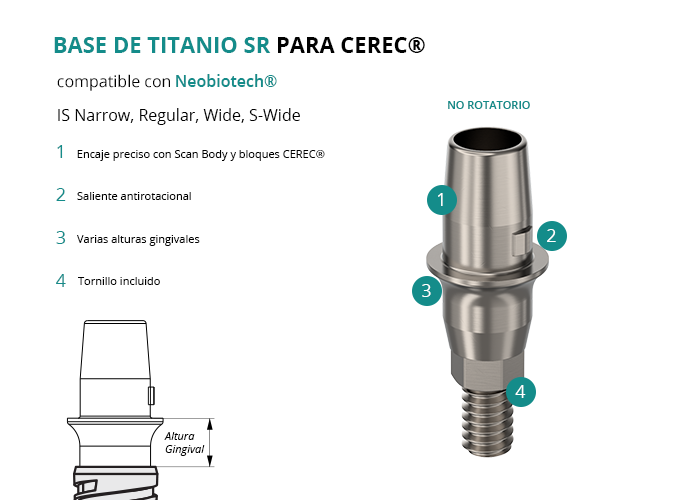 Las Bases de Titanio SR para CEREC® de GT-Medical son compatibles con los implantes IS Narrow, Regular, Wide, S-Wide de Neobiotech®, fabricadas en Titanio de Grado 5 para una conexión precisa y duradera. Cuentan con un saliente antirotacional que asegura el encaje perfecto con los scan bodies y bloques fresables de CEREC, evitando la rotación. Están disponibles en diversas alturas gingivales para adaptarse a cada caso. El tornillo está incluido en el envase.
