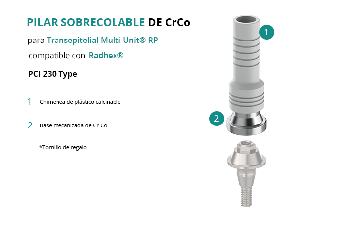 El Pilar Calcinable con Base de Cr-Co de GT-Medical es compatible con la línea de implantes PCI 230 Type de la marca Radhex®, proporciona una base sólida para la estructura protésica y garantiza un ajuste óptimo con el Transepitelial Multi-Unit® RP. Está formado por una base mecanizada de Cromo Cobalto y una chimenea de plástico calcinable.