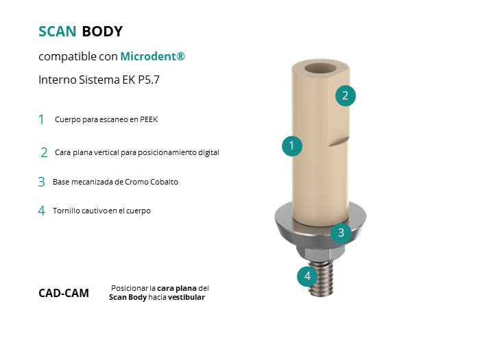 - CAD-CAM: Posicionar la cara plana del Scan Body hacia vestibular.