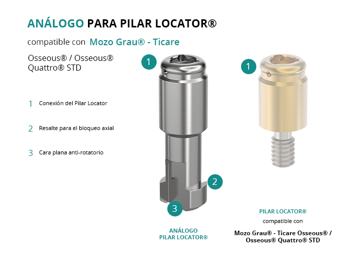 El análogo para Pilar Locator® es fundamental para crear el modelo de una restauración de sobredentadura removible que utilice pilares Locator® sobre implantes, como por ejemplo los de Mozo Grau® - Ticare de plataforma Osseous® / Osseous® Quattro® STD.