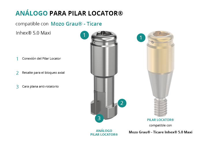 El análogo para Pilar Locator® es fundamental para crear el modelo de una restauración de sobredentadura removible que utilice pilares Locator® sobre implantes, como por ejemplo los de Mozo Grau® - Ticare de plataforma Inhex® 5.0 Maxi.